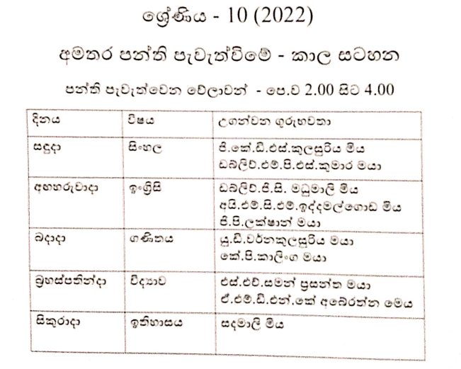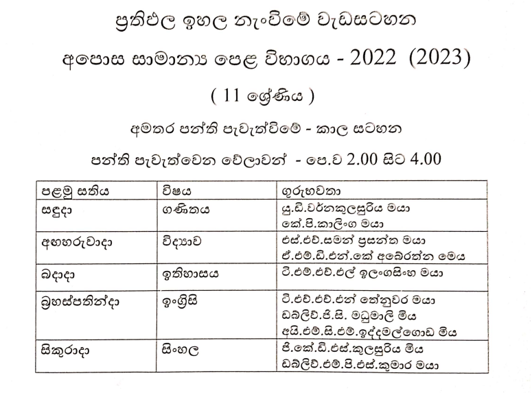 2023 අ.පො.ස සා /පෙළ විභාගය ඉලක්ක කර 11 ශ්රේණියේ දරුවන් උදෙසා පාසල් කාලයෙන් පසුව ක්රියාත්මක කිරීමට අපේක්ෂිත ඉගෙනුම් ඉගැන්වීම් ක්රියාවලිය 2023 /02/27 වන සඳුදා ප.ව. 2.00 සිට 4.00 දක්වා කාලය තුල ලබා දී ඇති කාල සටහනට අනුව පැවැත්වෙන බවත්, ඒ ලෙසම 10 ශ්රේණියේ දුදරුවන් සඳහා අදාළ කාල සීමාව තුල ඔවුන්ට ලබා දී ඇති කාල සටහනට අනුව එම ඉගෙනුම් ඉගැන්වීම් ක්රියාවලියද පවත්වන බවත් දන්වමි.